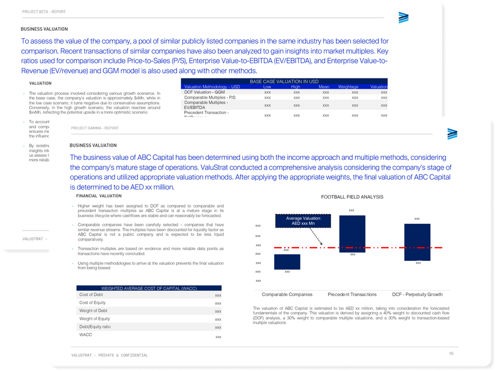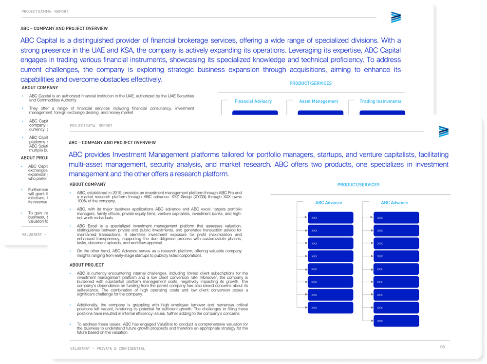 Our reports can be used for investment analysis, transactions, financial reporting, investor pitches, partnership agreements, and other key decisions.