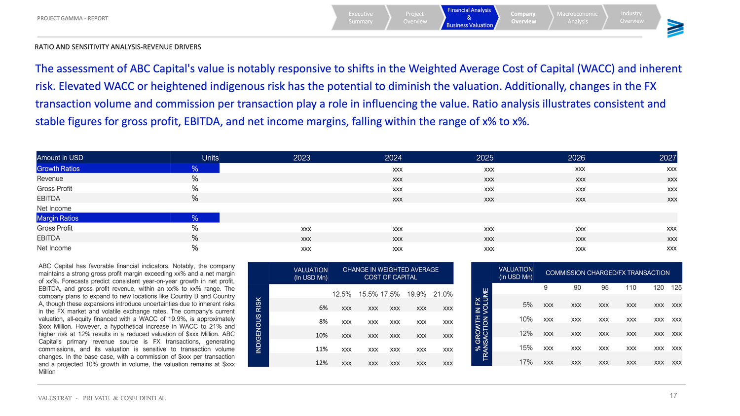 Within the business valuation section, we will employ established methodologies such as DCF (Discounted Cash Flow), comparable company analysis, and precedent transactions, meticulously tailored to the company's specifics. This will result in a presentation of valuation ranges, supported by visually presented sensitivity analyses, comprehensive ratio assessments, and insights into underlying growth assumptions.