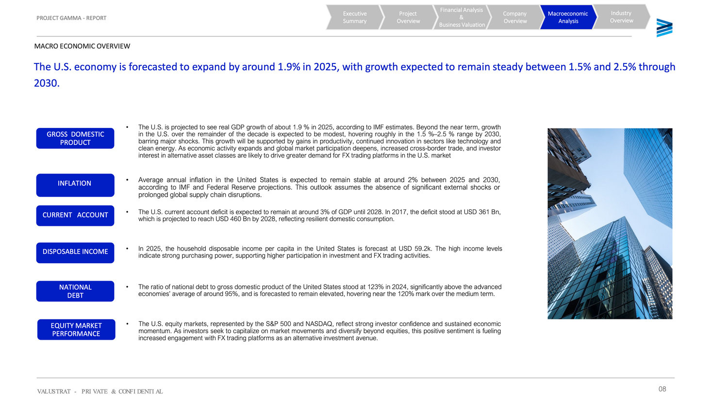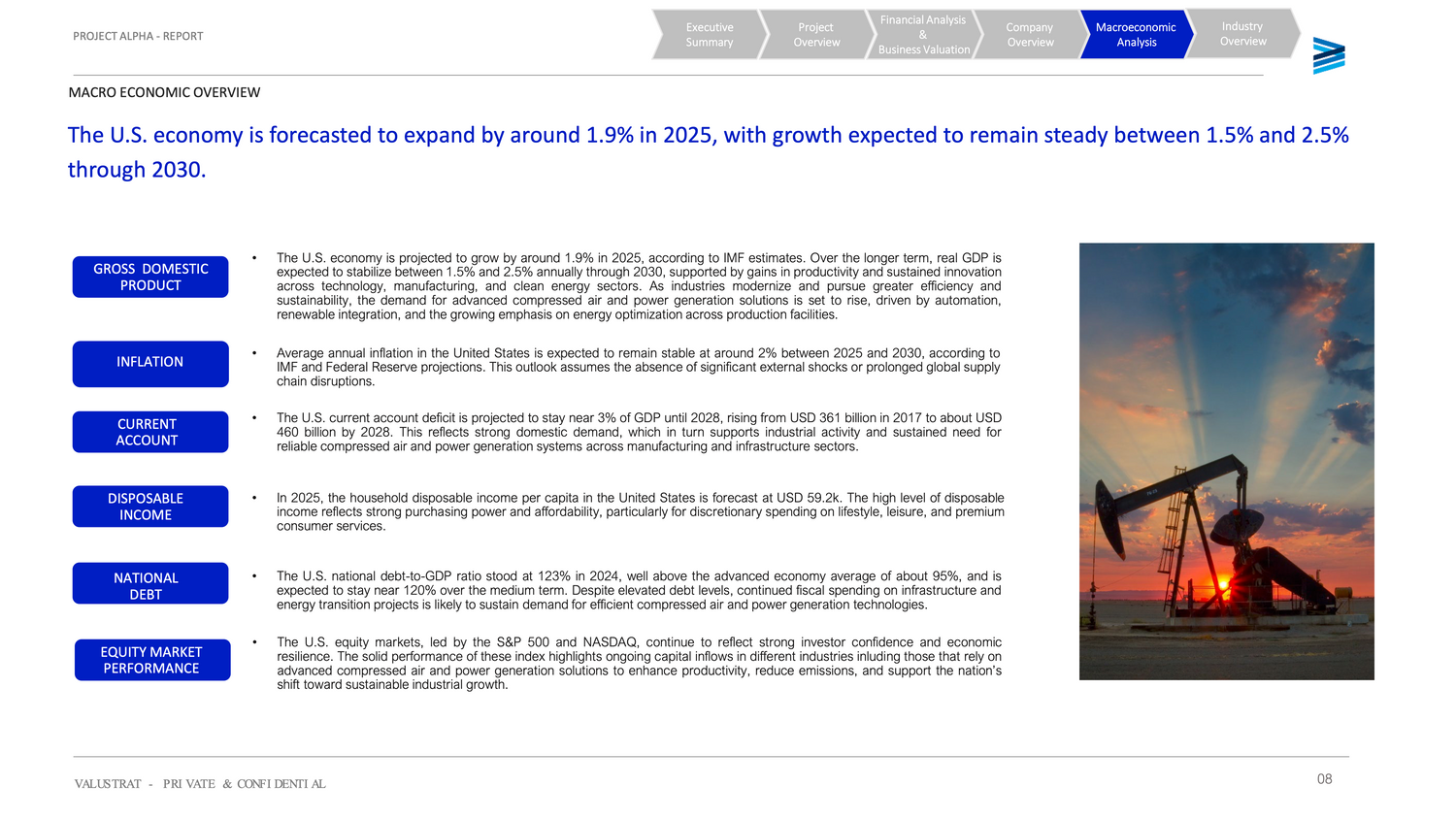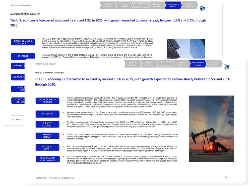 In the macroeconomic analysis section, we will conduct an assessment of crucial macroeconomic factors that impact valuation, including GDP growth, inflation, interest rates, fiscal policy, regulatory landscape, and other pertinent indicators specific to the company's industry and markets.